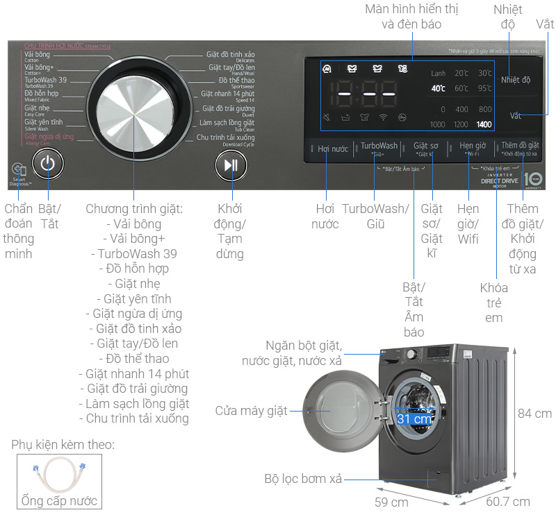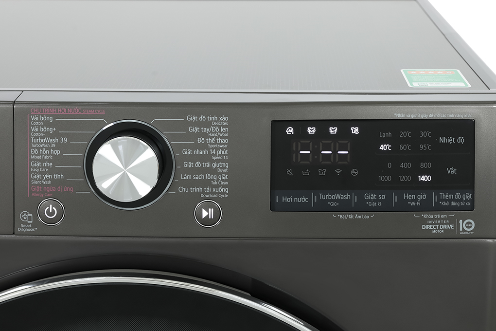 - Mẫu máy giặt này được thiết lập 14 chương trình giặt: vải bông, TurboWash 39, vải bông +, giặt hơi nước đồ trẻ em, giặt ngừa dị ứng, chu trình tải về, giặt nhanh 14 phút, giặt nhẹ, giặt ga giường, đồ hỗn hợp, giặt tay + đồ len, đồ thể thao, đồ tinh xảo và vệ sinh lồng giặt. Tùy theo từng loại quần áo, đồ dùng, chất liệu mà bạn lựa chọn chương trình giặt thích hợp nhất.