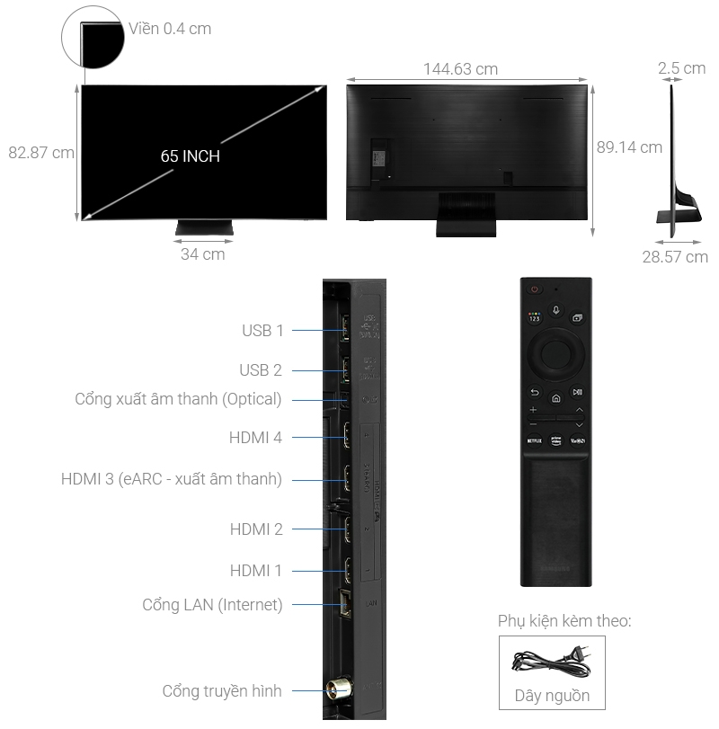 - Với màn hình 65 inch, chiếc tivi như biến thành một bức tranh điện tử lớn lấp đầy bức tường trống trải của bạn khi bố trí kiểu treo tường. Đi kèm sản phẩm còn có chân đế kim loại chữ L thiết kế cách điệu tăng thêm sự cá tính cho tivi đồng thời giúp lắp đặt thiết bị ổn định trên kệ tủ.